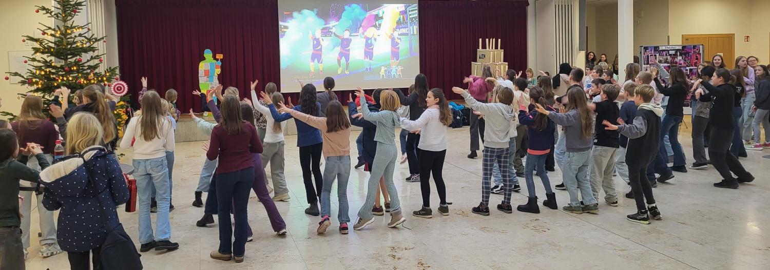 Anlässlich des Tags der Menschenrechte am 10.12. veranstaltete die UNESCO-AG eine bunte Menschenrechts-Party. Mit einer besonderen Geburtstagstorte wurden die Menschenrechte symbolisch gefeiert – und zugleich kritisch hinterfragt. In der ersten Pause sorgte das Lied „On écrit sur les murs“ – „Wir schreiben auf die Wände“ für Aufmerksamkeit. Im Lied geht es darum, Worte der Hoffnung, der Liebe und des Miteinanders sichtbar zu machen. So, als würden sie an eine große Wand geschrieben werden, damit niemand sie übersehen kann. Denn genau darum geht es bei den Menschenrechten: Sie sollen für alle sichtbar und für jeden spürbar sein.